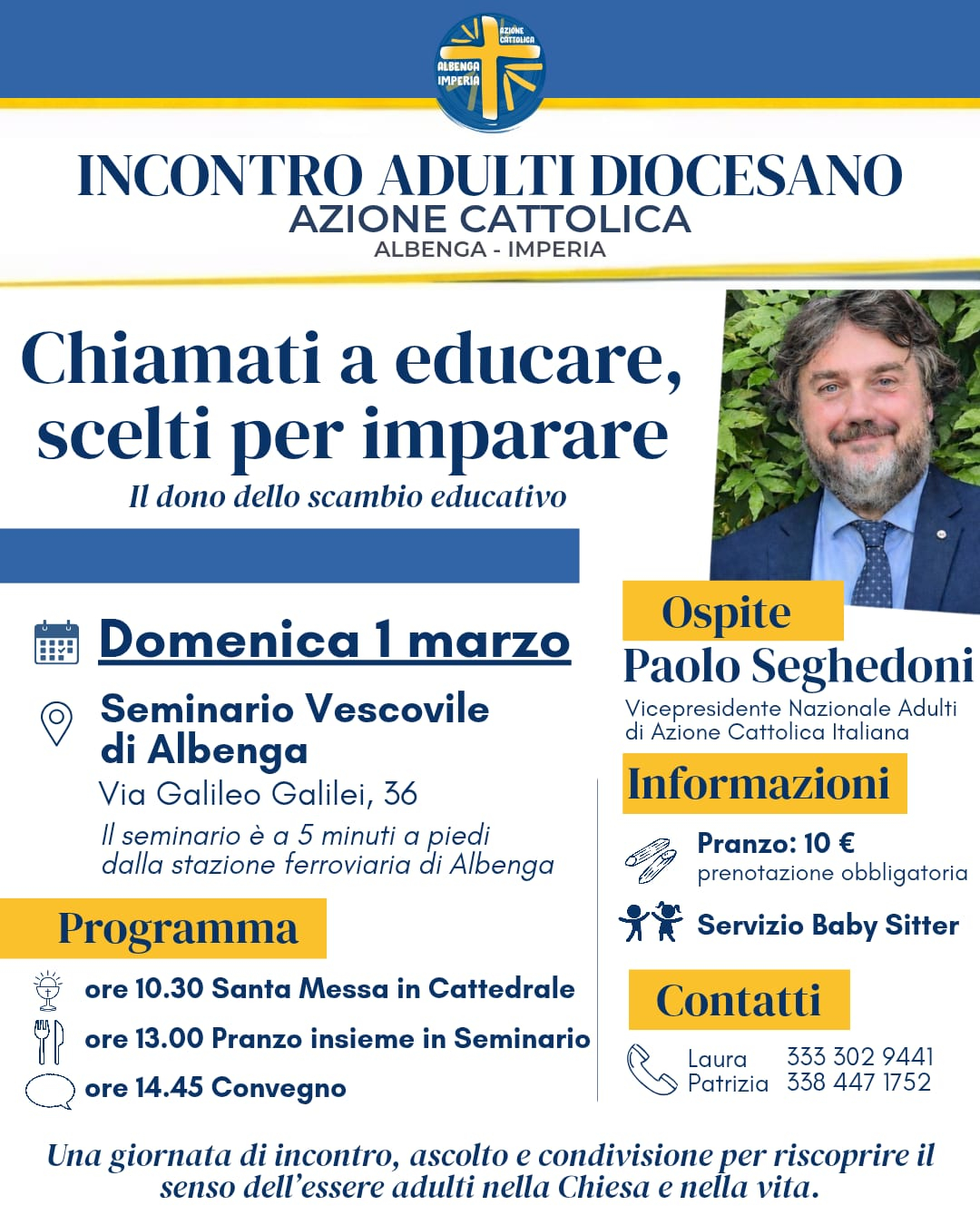In un tempo in cui l’educazione sembra spesso un terreno fragile, fatto di equilibri delicati e responsabilità condivise, l’Azione Cattolica della diocesi di Albenga-Imperia propone un appuntamento che va dritto al cuore della vita adulta nella Chiesa: l’Incontro Diocesano Adulti, in programma domenica 1° marzo presso il Seminario Vescovile di Albenga.