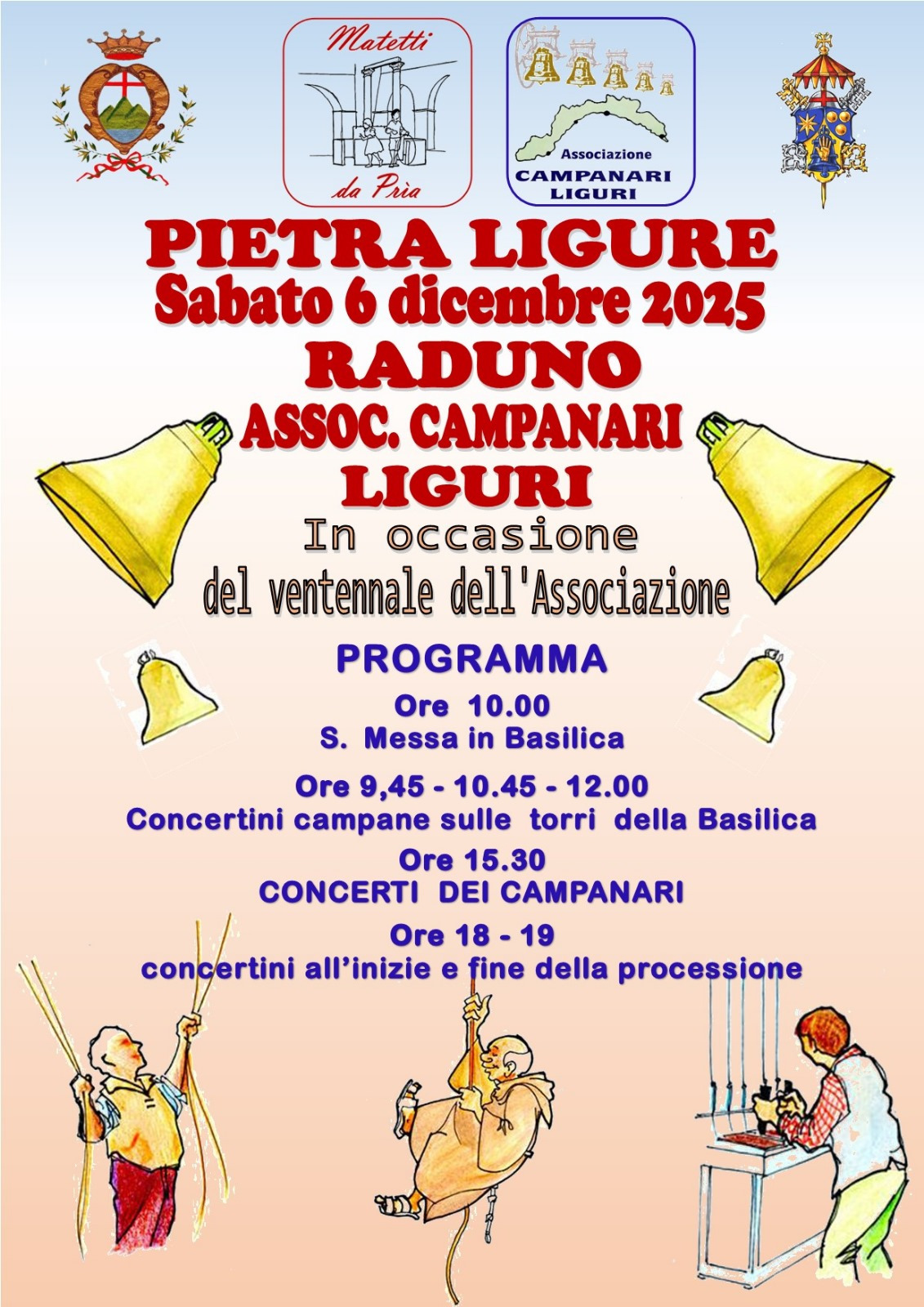 Sabato 6 dicembre 2025 Pietra Ligure si riempirà di musica e tradizione: l’Associazione Campanari Liguri renderà omaggio al nostro Santo Patrono con una serie di concerti dai campanili della Basilica, celebrando al tempo stesso i vent’anni dalla loro costituzione.
