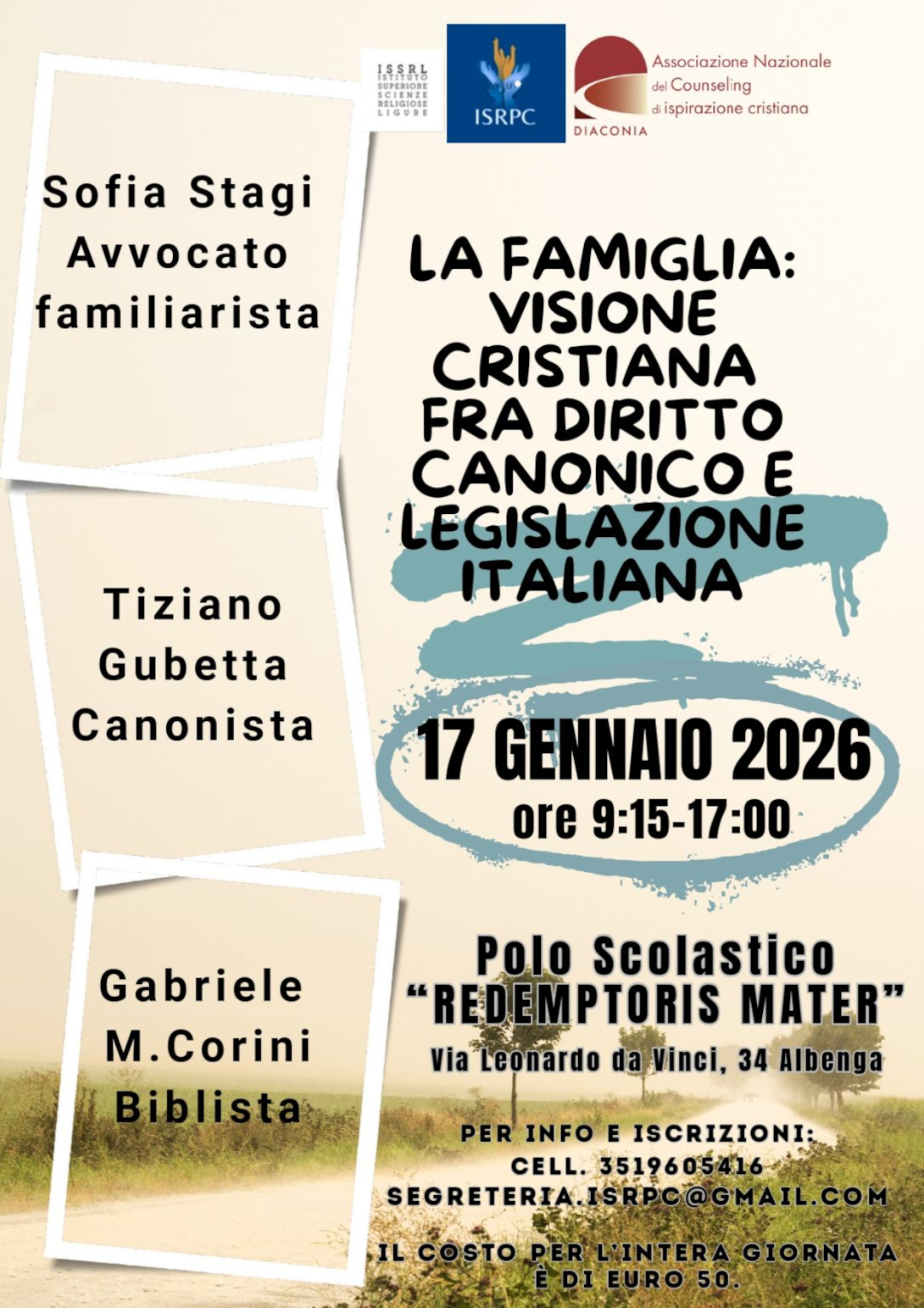 6 Gen 2026 GIORNATA DI FORMAZIONELA FAMIGLIA: VISIONE CRISTIANAFRA DIRITTO CANONICO ELEGISLAZIONE ITALIANA di Giacomo Pastorino | postato in: NEWS, EVENTI E INFORMAZIONI | 0 © Diocesi di Albenga-Imperia » CONDIVIDI SU