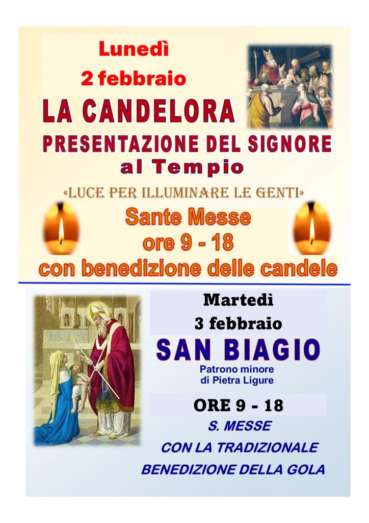 Le candele verranno benedette in Basilica durante le due S.Messe delle ore 9,00 e delle ore 18.00; si consiglia di portarle a casa e di accenderle nei momenti importanti dell'anno come segno della presenza di Cristo che deve illuminare la nostra vita.