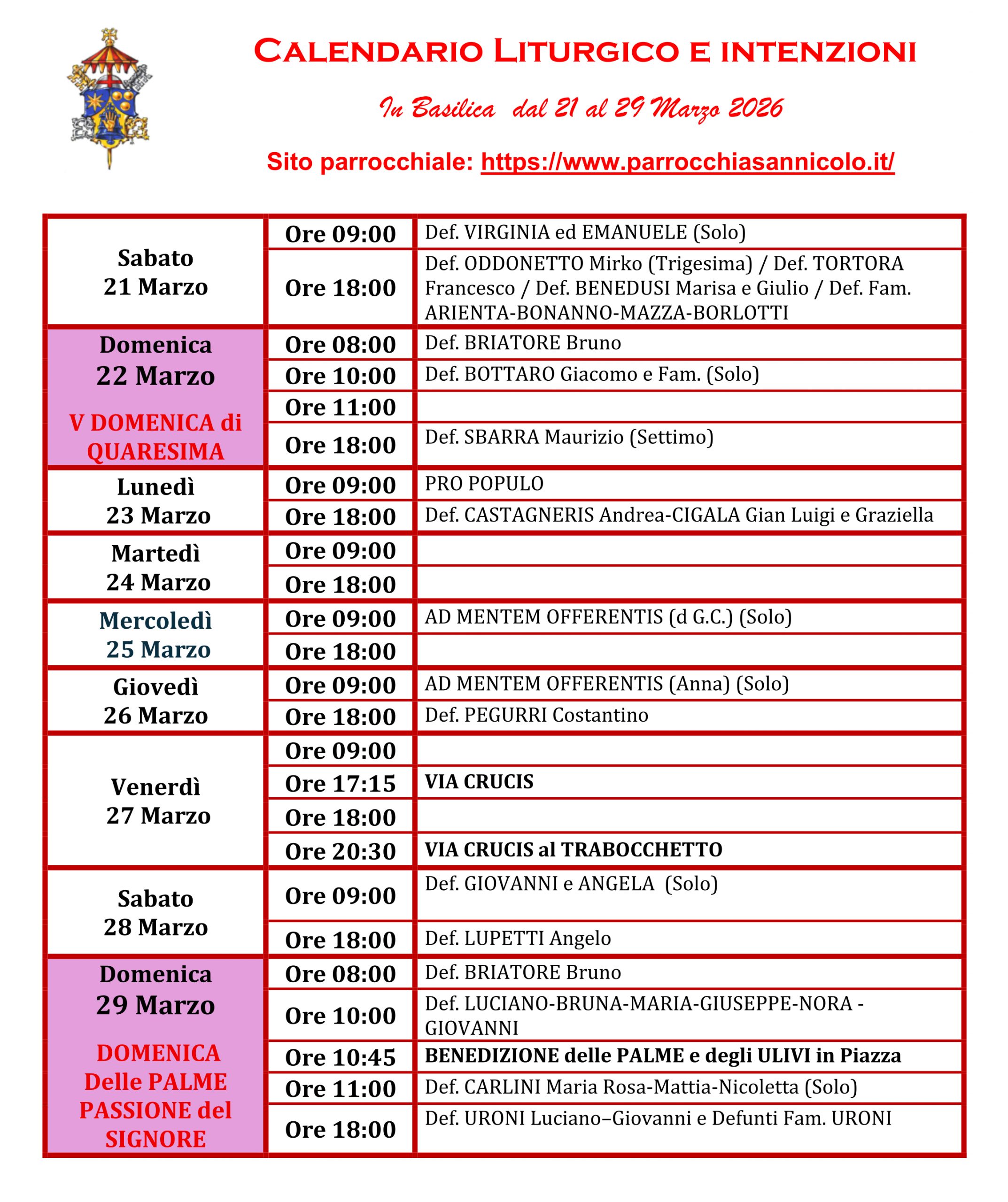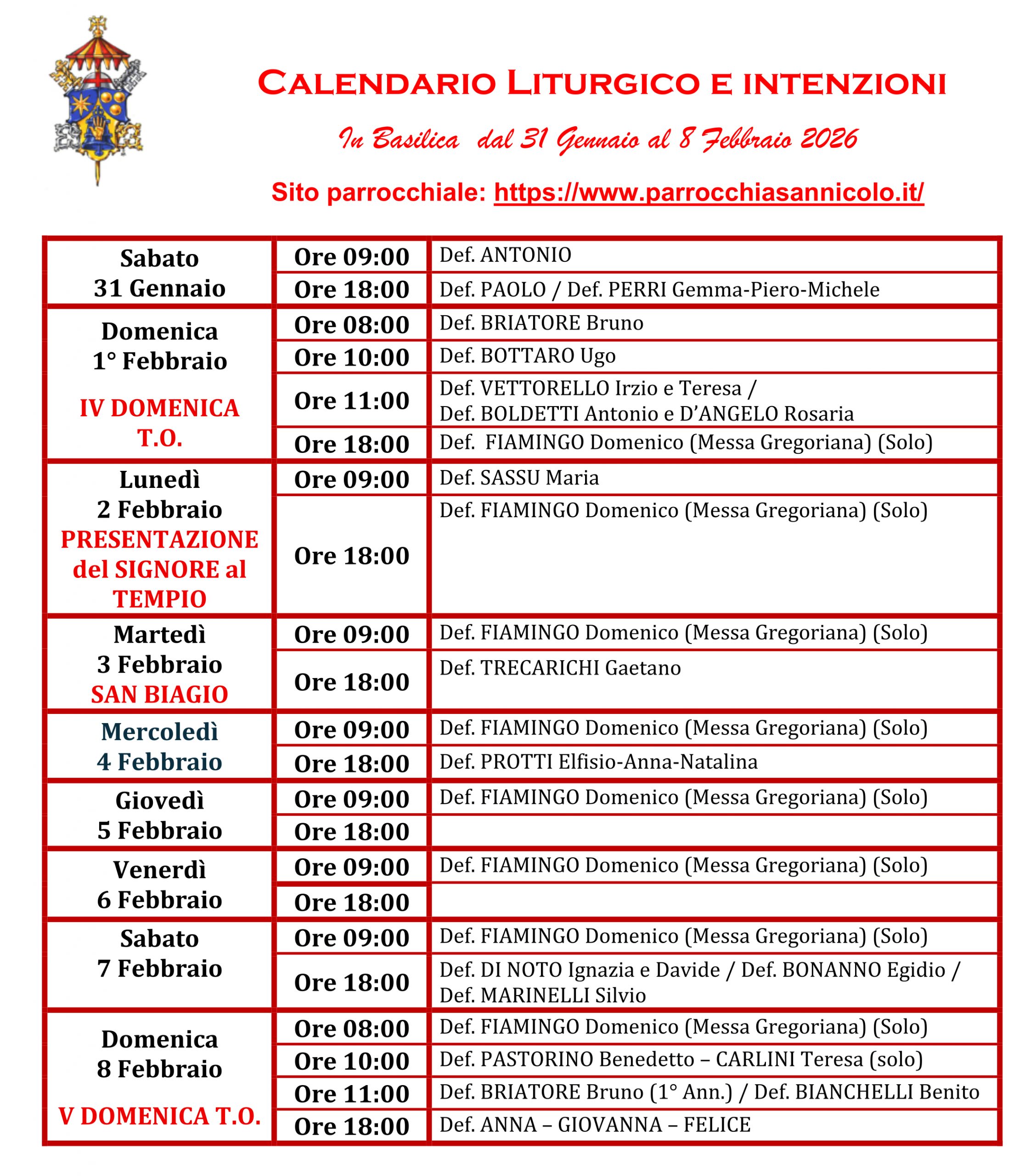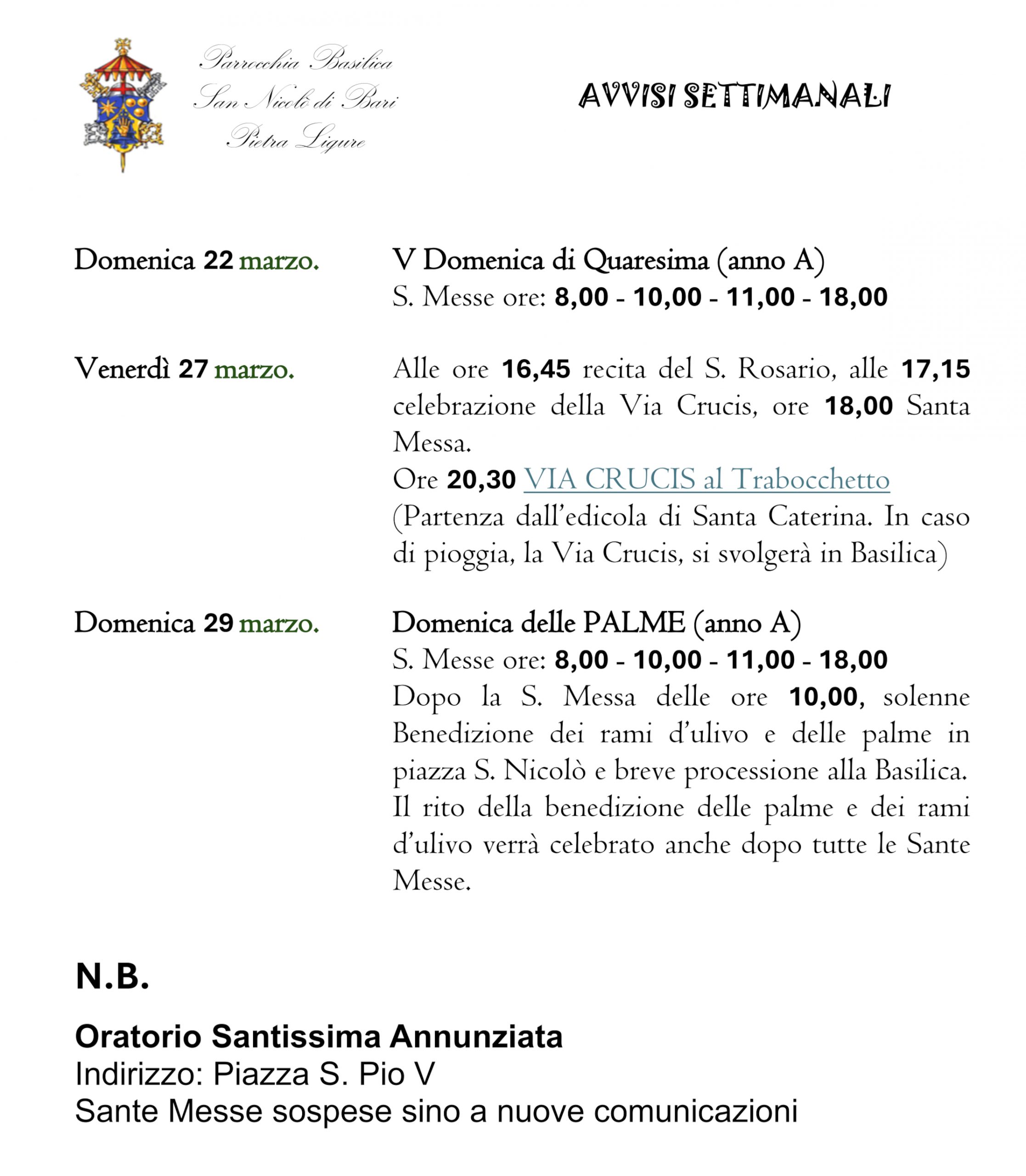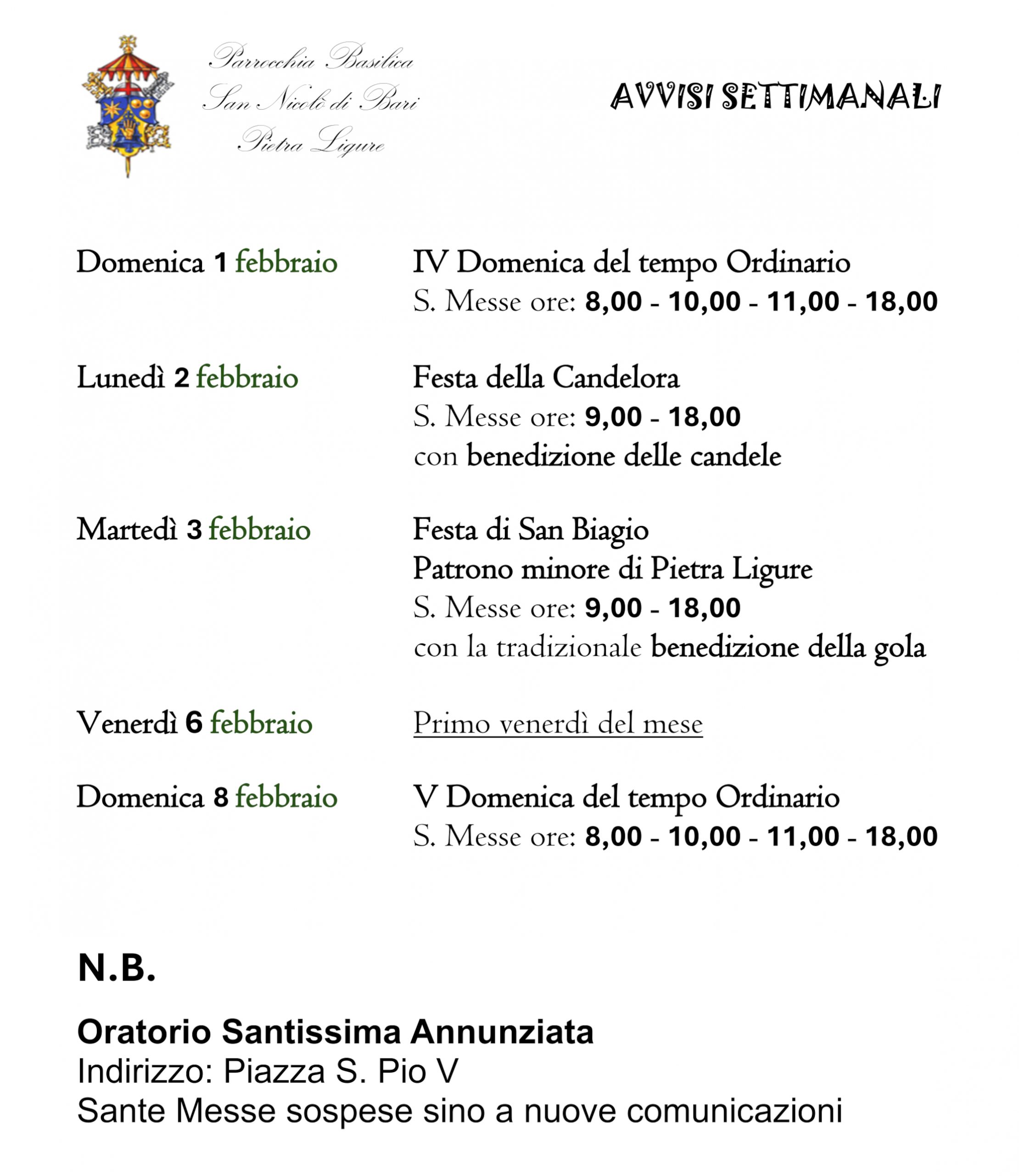 N.B. Verificare occasionali variazioni sull'orario delle celebrazioni della settimana e negli avvisi settimanali